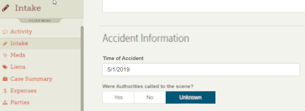 Often knowing the exact date of loss or date of the incident is helpful when locating records. Just use Filevine's intake section and fill out the Time of Accident field; it will be automatically carried over to your record request.