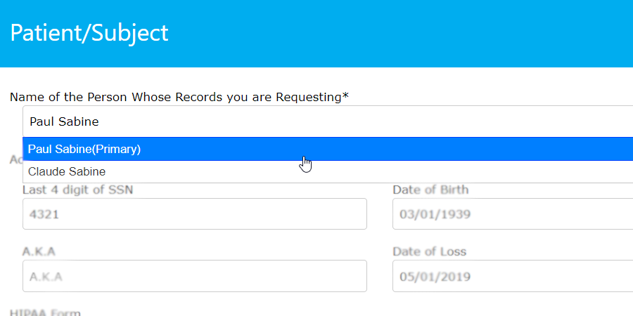 Record retrieval often faces unexpected delays because of incorrect information provided; it's easy to make a typo in a name or date of birth. When you use our Filevine integration, the project's contacts will be presented in a simple, drop-down menu on our portal. In the case of multiple contacts, we detect the ones you most likely need records for and ignore the others.